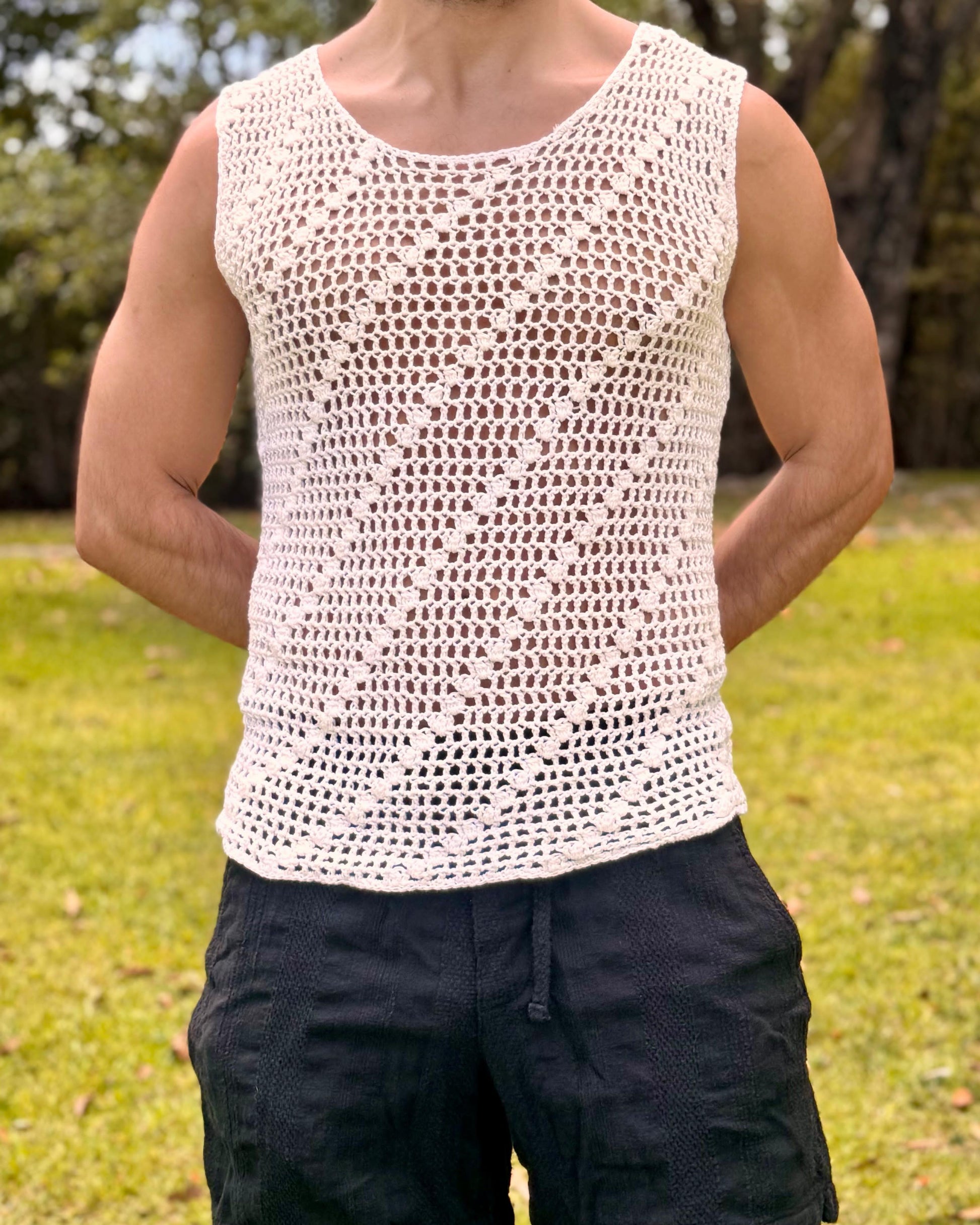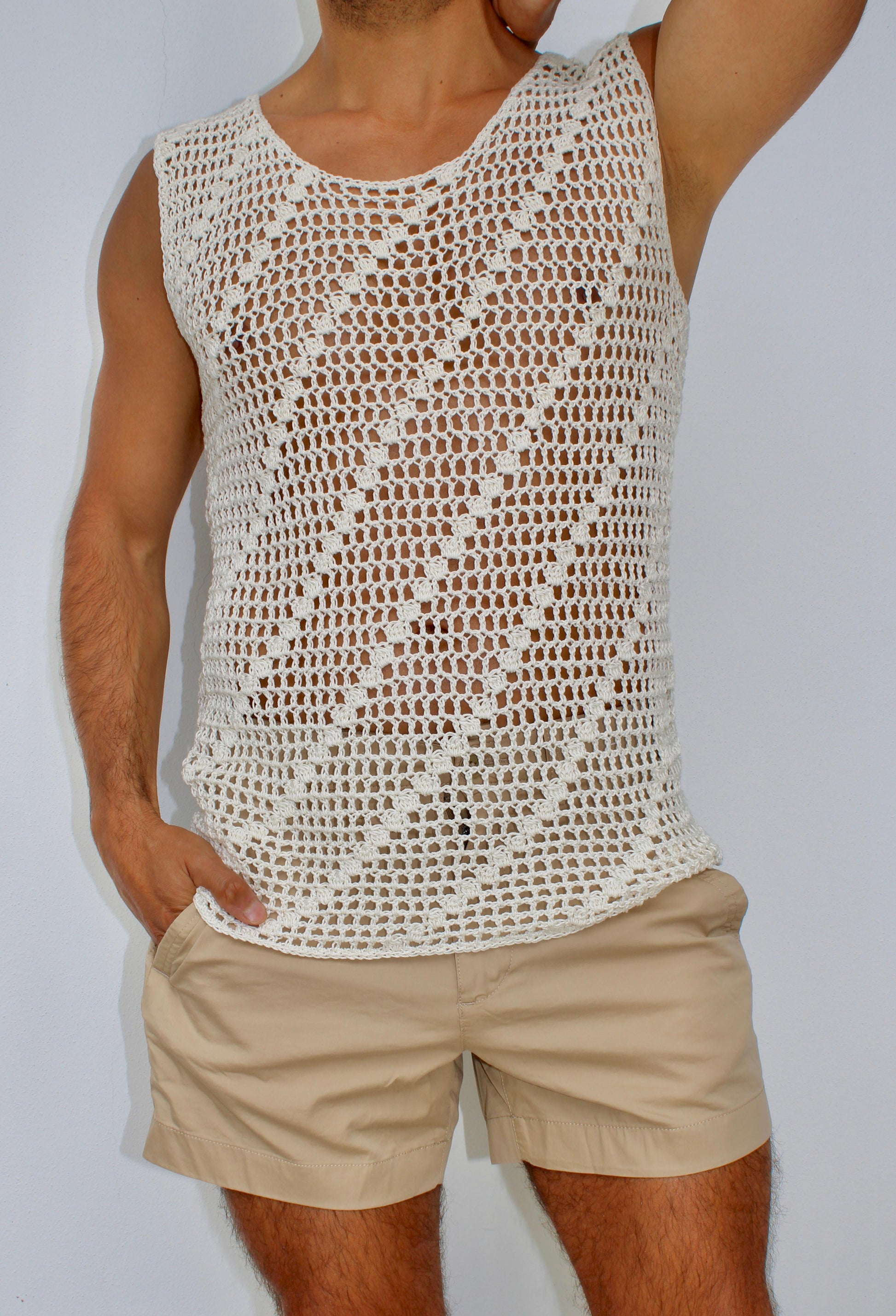 Looking for a lightweight, breathable, and stylish summer piece? Our Crochet Men's Fishnet Tank Top is a unique handmade garment crafted with care and individuality in every stitch. Whether you're heading to the beach, a summer festival, or just want to make a bold statement — this see-through crochet tank top is designed to turn heads.
